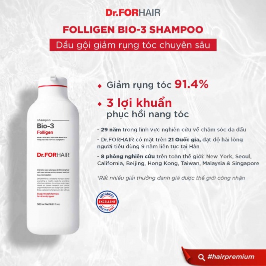 Dầu gội ngăn ngừa rụng tóc chuyên sâu Dr.FORHAIR FOLLIGEN BIO-3 500ml