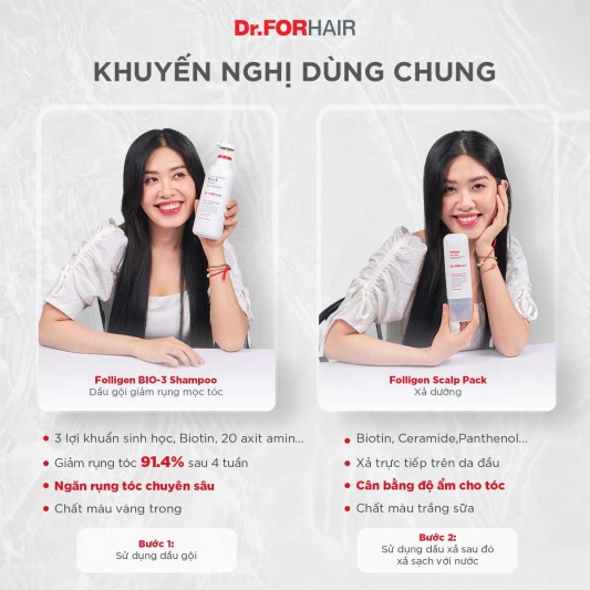 Nên dùng kết hợp dầu gội Folligen Bio-3 giúp giảm rụng tóc chuyên sâu và xả dưỡng Folligen Scalp Pack để tăng hiệu quả giảm rụng, hỗ trợ mọc tóc. Dầu xả dưỡng Folligen Scalp Pack có thể dùng được trên da đầu giúp cân bằng độ ẩm sau khi gội, khóa lại dưỡng chất cần thiết để nuôi dưỡng da đầu và sợi tóc.