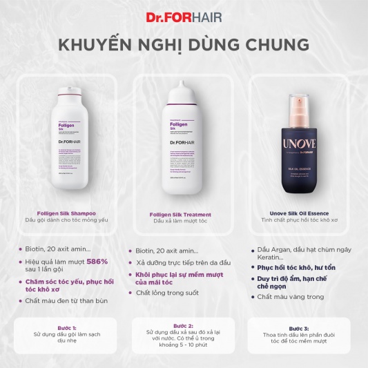 Dr.FORHAIR khuyến nghị nên dùng kèm dầu gội Folligen Silk tinh dầu dưỡng tóc UNOVE Silk Oil Essence để phục hồi mái tóc từ gốc đến ngọn.