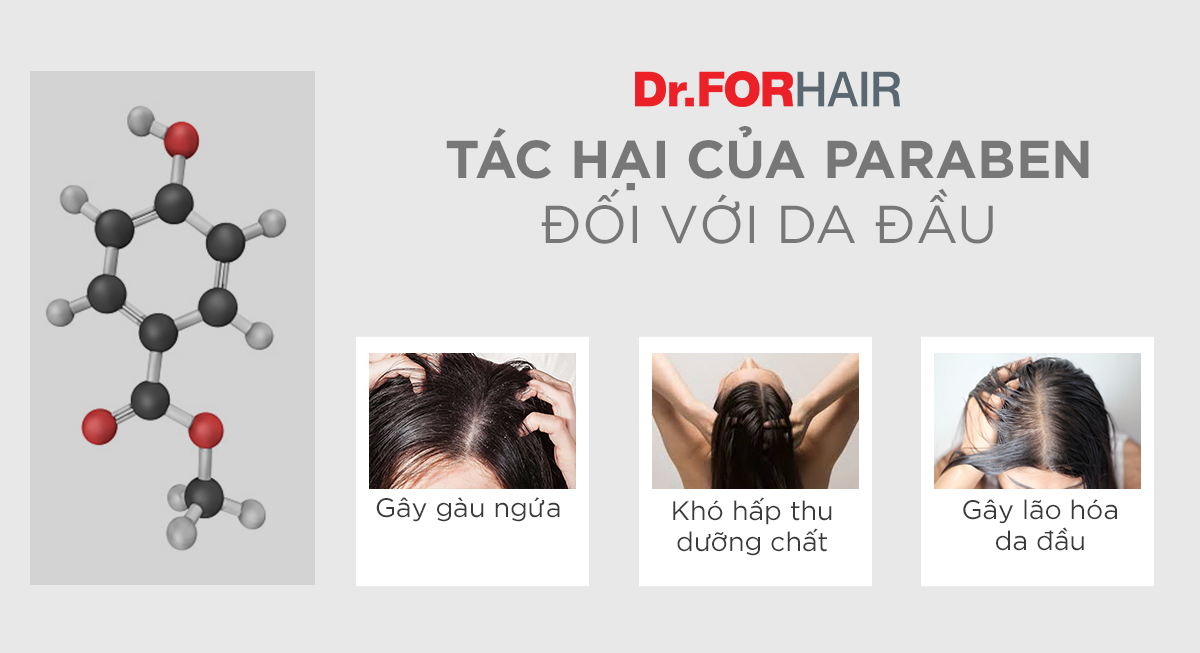 - Gây bít tắc nang tóc: Paraben khi len lỏi vào các chân tóc sẽ rất khó làm sạch bởi nó kỵ nước. Và paraben còn có thể giữ lại lượng lớn tế bào chết, bã nhờn gây hại cho nang tóc, dễ gây ra gàu và viêm da đầu.