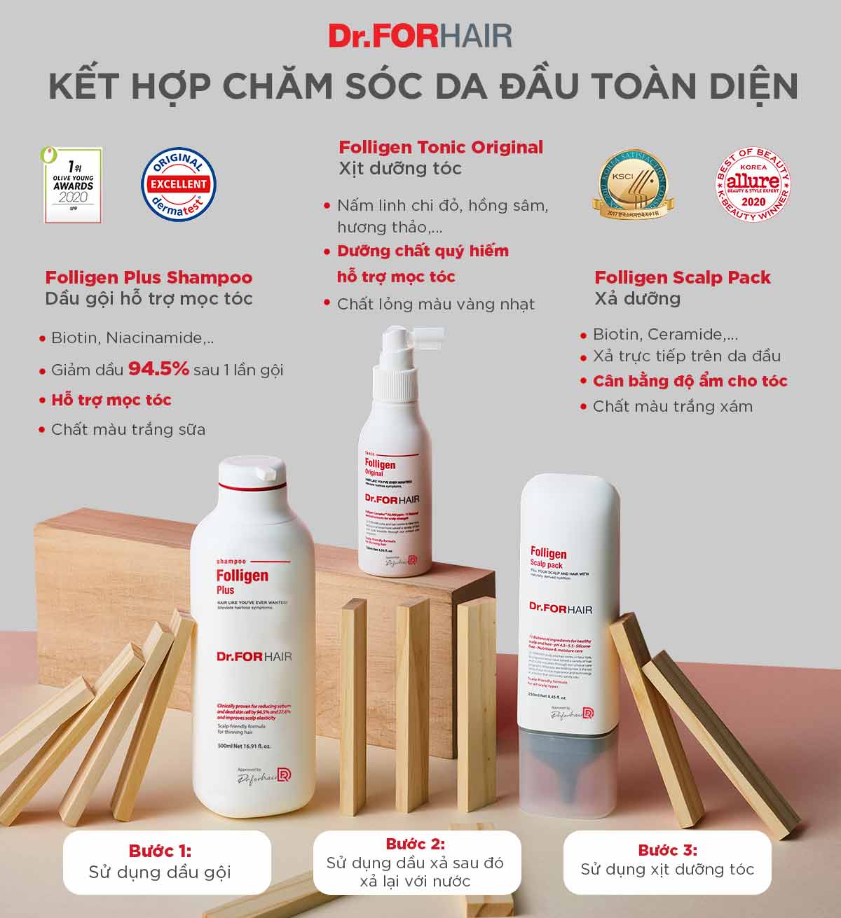 Để tăng nhanh hiệu quả mọc tóc, có thể dùng kèm dầu gội Folligen Plus và dầu xả Folligen Scalp Pack. Dầu gội Folligen Plus giúp làm sạch nang tóc, công nghệ Liposome đưa dưỡng chất vào thẳng nang tóc. Dầu xả Folligen Scalp Pack cân bằng lại độ ẩm, độ pH sau khi gội và nuôi dưỡng da đầu. Hai sản phẩm này sẽ là tiền đề giúp tinh chất mọc tóc Folligen Tonic phát huy tối đa công dụng của mình.